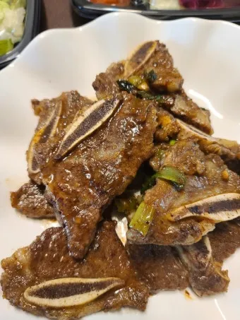 두 번째는 도토리묵이에요. 묵의 시원한 맛이 갈비의 진한 맛과 대비되면서 입안을 깔끔하게 만들어줘요.