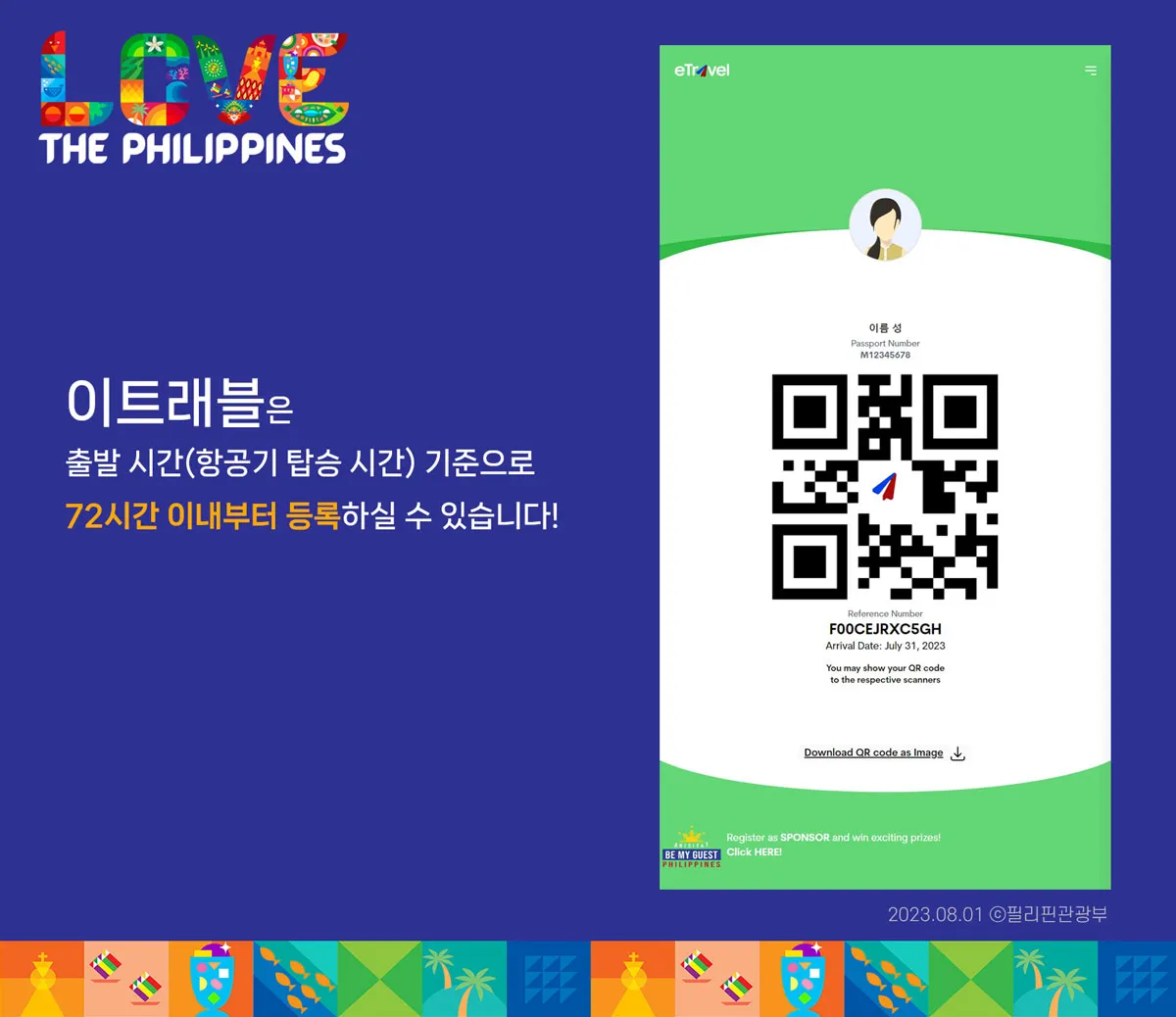 등록은 etravel.gov.ph 공식 웹사이트에서만 가능하고, 완전 무료예요. 유료로 QR코드를 발급해준다는 사이트는 100% 사기니까 절대 속지 마세요.