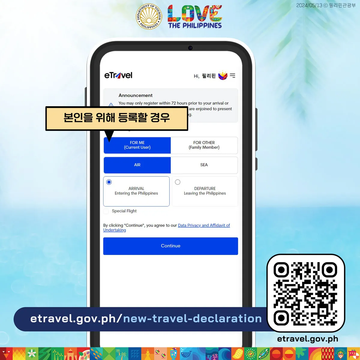 필리핀 이트래블 eTravel은 출발 72시간 전부터 등록 가능하며, 입국신고서·건강확인서·세관신고서를 대체하는 필수 전자 시스템으로 모든 외국인 입국자는 QR코드 발급 후 공항에서 제시해야 합니다.