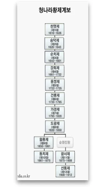 청나라 황제 계보의 특징은 말기로 갈수록 황제의 실권이 약해졌다는 점입니다. 특히 서태후라는 여성이 47년간 실질적으로 청나라를 지배한 건 매우 이례적인 일이에요.
