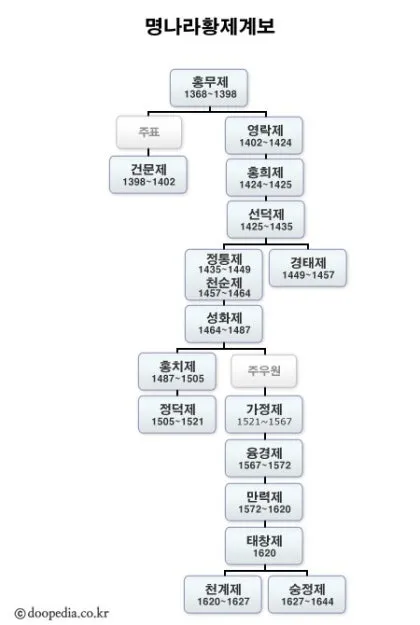 명나라의 황제 가계도를 자세히 들여다보면 직계 계승이 순조롭지 않았던 시기가 꽤 있었다는 걸 알 수 있습니다.