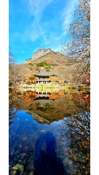 백양사의 쌍계루와 앞 연못은 단풍 감상의 백미입니다. 고풍스러운 누각과 맑은 물, 그리고 수면 위에 비친 단풍의 데칼코마니 풍경은 정말 환상적이에요.